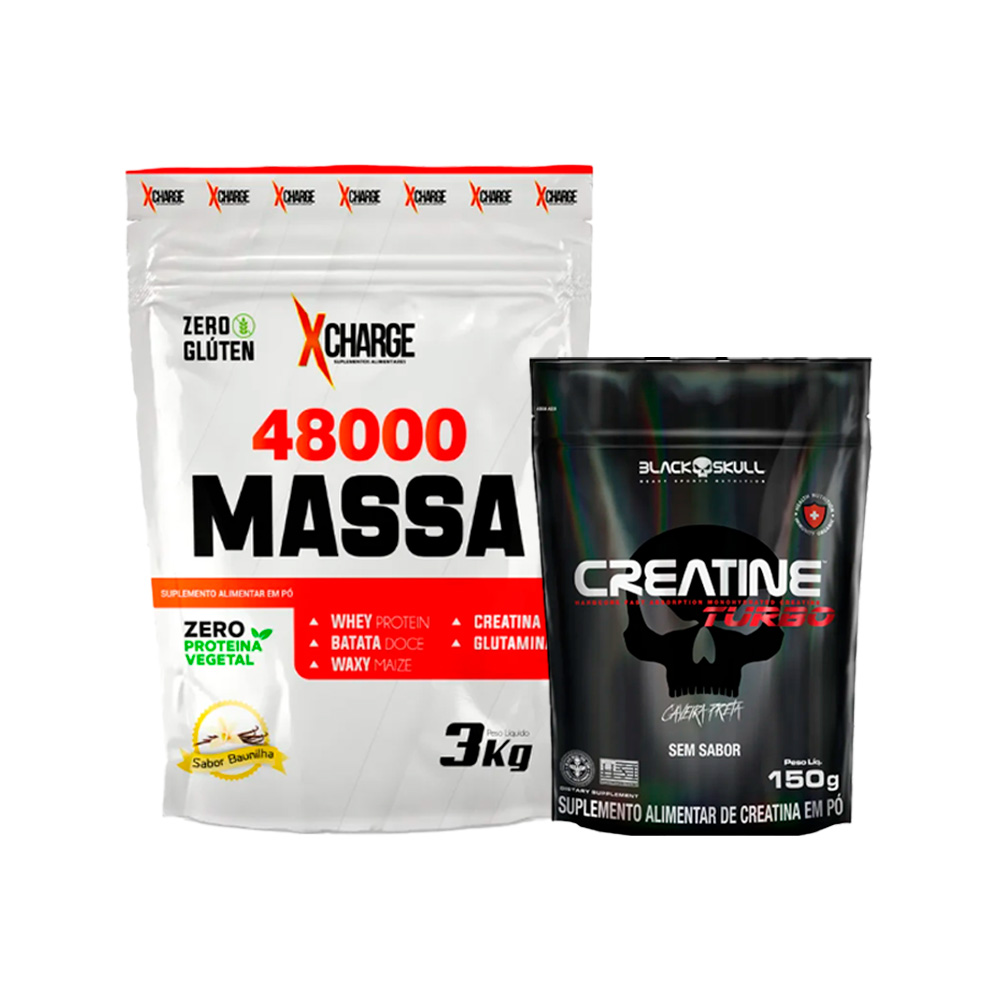 Kit composoto por: 1 4800 Massa Hipercalórico - X-Charge - 3KG 1 Creatina Turbo - Black Skull - 150G (REFIL)